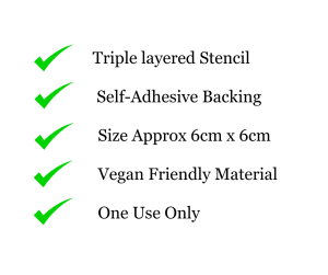 | Directions | Remove paper backing from rear of stencil – Place stencil onto desired area of skin – Remove clear top layer – Apply thin layer of body adhesive to the inside area of the stencil – Wait for the glue to become clear (opaque) – Apply glitter to the stencil using the small / medium brush – Use the large brush to remove excess glitter – Gently peel away the stencil to reveal your beautiful glitter tattoo. |