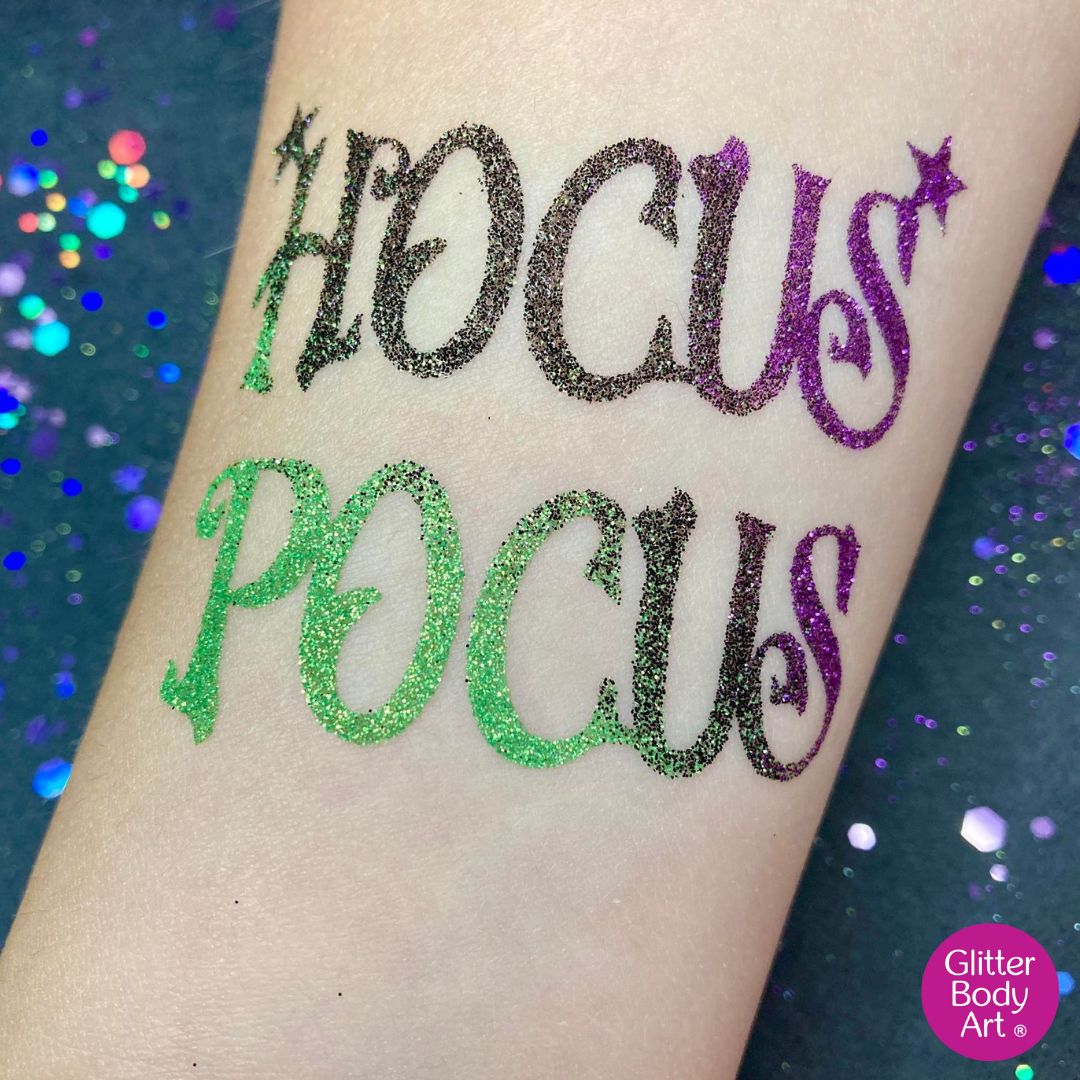 Our  Hocus Pocus Temporary tattoo stencils are templates used for creating sparkly glitter tattoos and are designed by Glitter Body Artglitter body art registered trademark