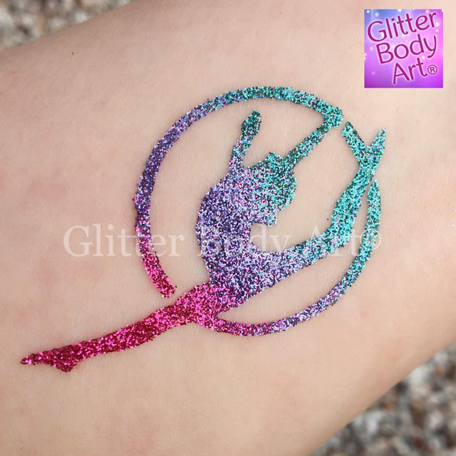 Remove paper backing from rear of stencil – Place stencil onto desired area of skin – Remove clear top layer – Apply thin layer of body adhesive to the inside area of the stencil – Wait for the glue to become clear (opaque) – Apply glitter to the stencil using the small / medium brush – Use the large brush to remove excess glitter – Gently peel away the stencil to reveal your beautiful glitter tattoo.